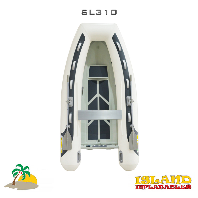 The Island (SuperLight) SL310 has much more room. Making it the perfect tender for larger cruisers / yachts. The rigid base is a single-skin Aluminium Floor. Keeping it lightweight but more durable than a fiberglass base. White / Grey features will fit in while floating next to your pride and joy