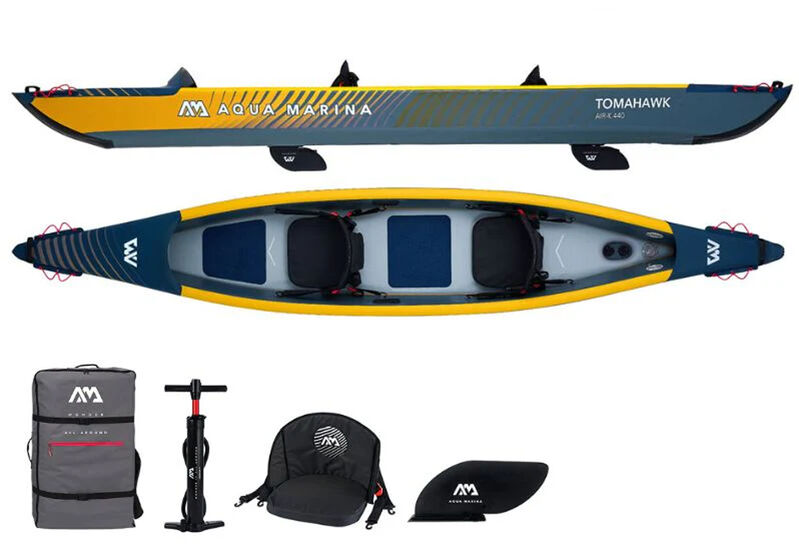 The LATEST Model TOMAHAWK AIR-K is a revolutionary inflatable kayak utilizing Drop Stitch Technology double-wall fabric for incredible rigidity and durability. It is super light, 40% lighter than a traditional hard canoe of the same class. AIR-K is designed for those who want to explore remote locations with friends in almost all types of water conditions.